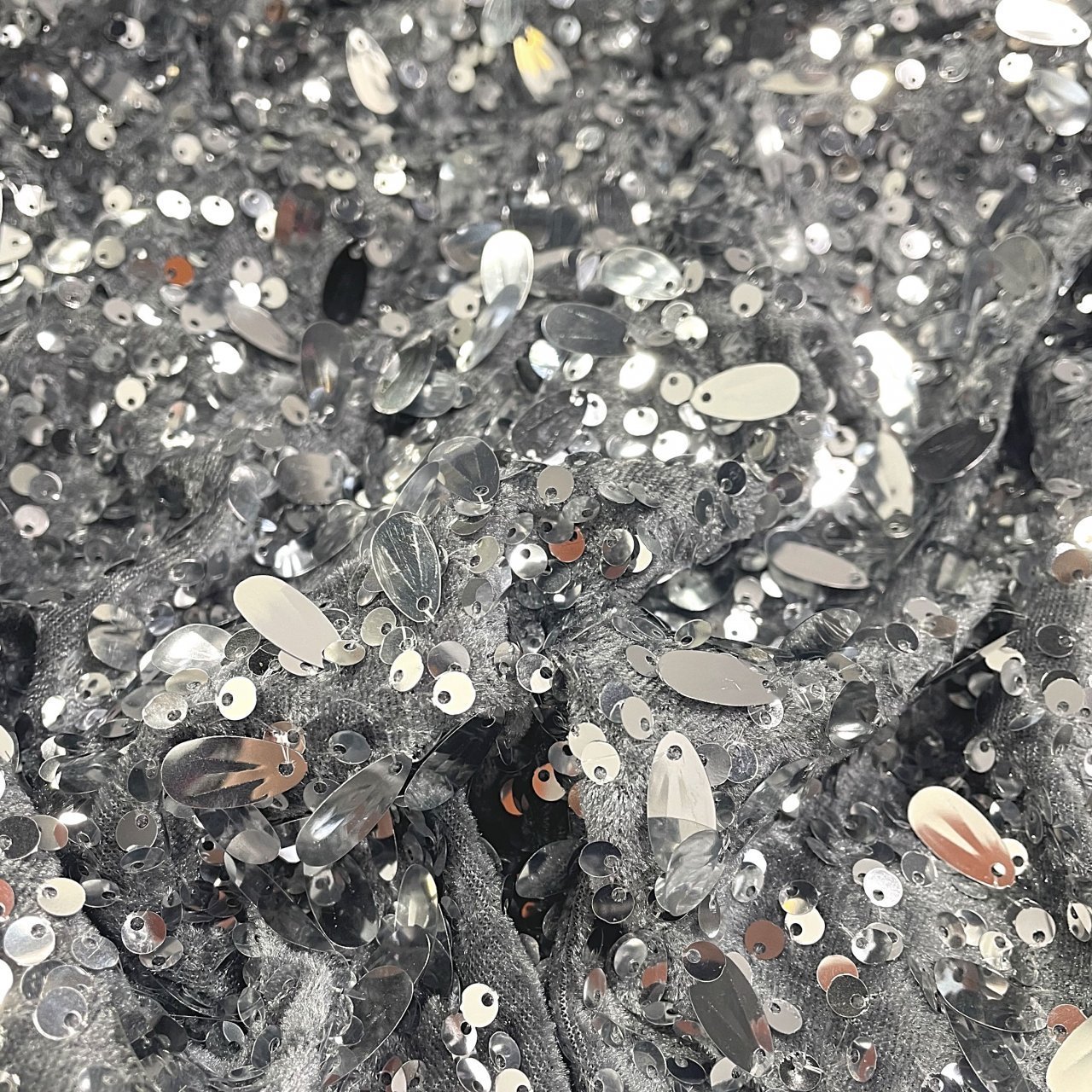 Тонкий стрейчевый бархат расшит пайетками и по всему полотну. Размер каждой пайетки 6 мм и плюс по всему полотну добавлены пайетки в виде капли, которые придают ткани дополнительный блеск при каждом движении. Великолепная ткань для создания цельного вечернего образа, или отдельных фрагментов изделия, которые придадут ему легкий шик и необычность.